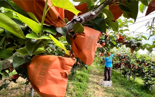 Bagging Asian pears with "ORCHARD DIRECT" labels and storing them separately post-harvest ensures traceability and prevents cross-contamination with other orchard fruits.